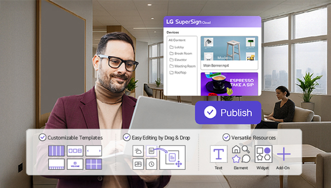 By utilizing a content management software solution, LG SuperSign Cloud, businesses can reduce the time spent on aggregating separate sources for content creation. LG SuperSign Cloud is a software solution that provides various efficient content management features with flexible editing functions for users to create and distribute content on their signage displays effortlessly.