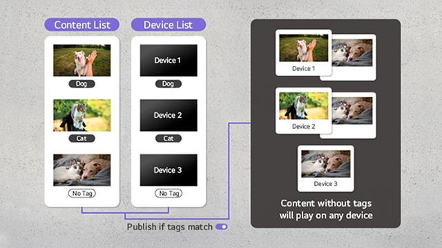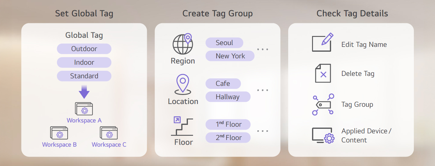 Users can monitor the overall tag list in a single view to check which tags have been assigned to each device or content. Additionally, users can group individual tags into tag groups or create a global tag that is used across the entire workspace.