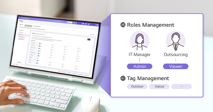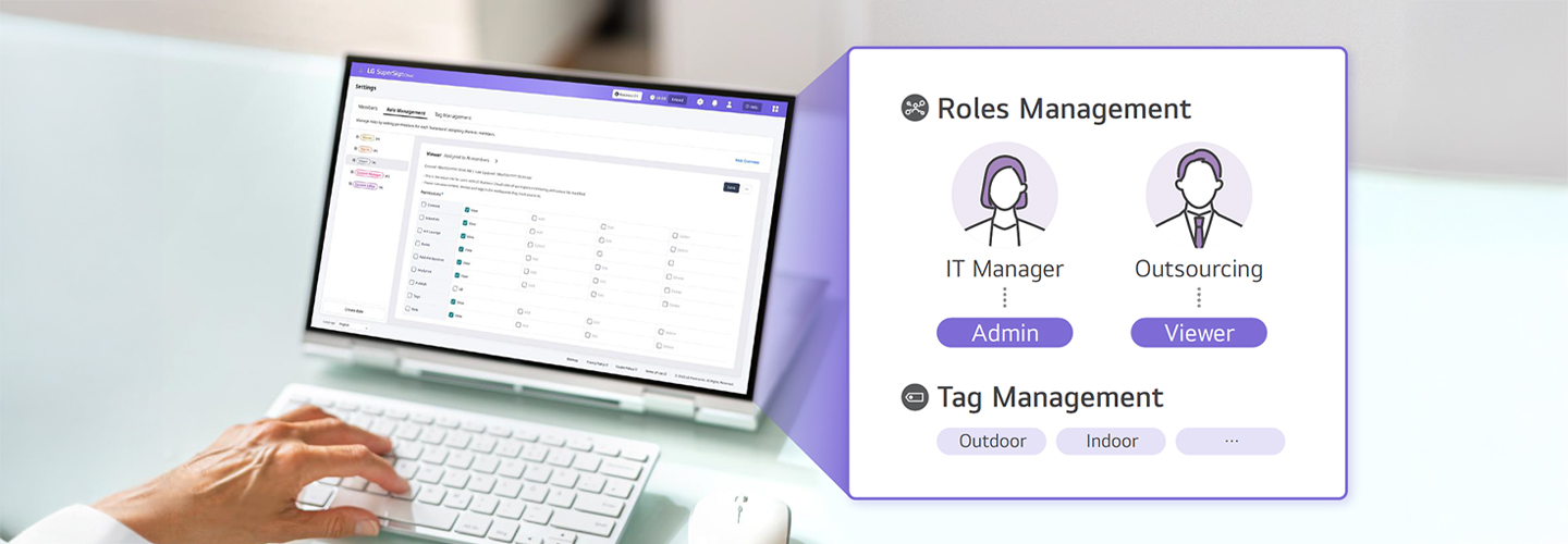 Assign roles to each account and set tags such as business site, workspace, or global to use LG SuperSign Cloud more efficiently.