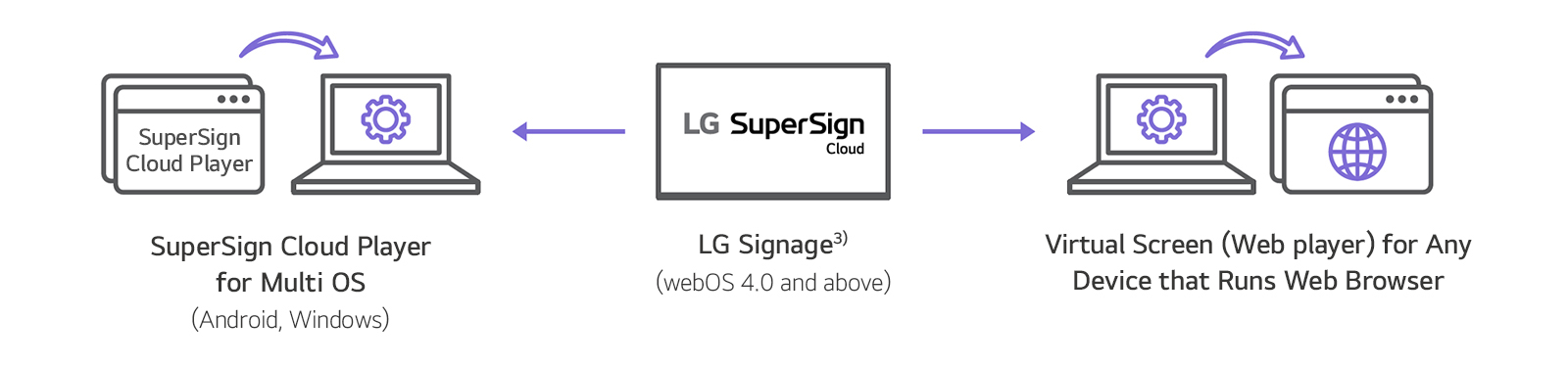 * Compatible with LG signage (webOS 4.0 and above) and devices with Android 9, 10 or 11 or Windows 10 or 11 version that has ‘SuperSign Cloud Player’ installed. Upon purchasing an LG SuperSign Cloud license, the ‘SuperSign Cloud Player’ installation file will be provided within the SuperSign Cloud platform. The applicability of the solution may vary by product, and support may be limited for certain webOS 4.0 and above signage models. For details, please check with your local sales team.